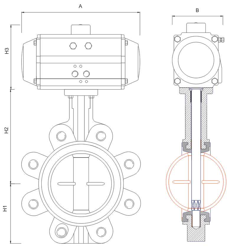 氣動蝶閥是以壓縮空氣為動力(正常情況下供氣壓力為0.4~0.6MPa),通過活塞齒條與齒輪的機械傳動, |
